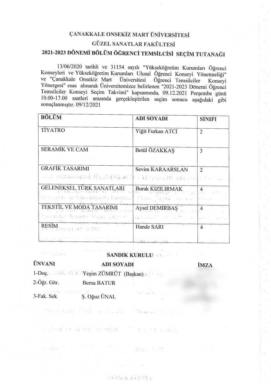 Güzel Sanatlar Fakültesi Öğrenci Temsilcisi Seçimi Sonucu