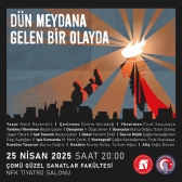 Tiyatro Bölümü son sınıf öğrencisi Fırat Soyukaya’nın, Oyun Projesi dersi kapsamında Dr.Öğr.Üyesi V.Özge Zeren danışmanlığında yönettiği, Mark Ravenhill’in “Dün Meydana Gelen Bir Olayda” isimli oyunu, 25 Nisan 2025 tarihinde NFK Tiyatro Salonunda prömiyer yaptı. Tiyatro Bölümü öğrencileri Burcu Doğru, Fırat Soyukaya, Ozan Hüseyin Güneş ve Uygar Öztürk’ün rol aldığı, Çağla Karaeğemen ve Ezgi Bahar Aydoğan’ın müziklerini yaptığı oyunumuz Mayıs ayı sonunda tekrar seyirciyle buluşacaktır.