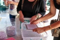 Atölye çalışmasının bir bölümünde katılımcılara atık kağıtların dönüştürülerek yeniden kâğıt haline getirilme süreci gösterilirken diğer bölümünde atık meşrubat ambalajları ile çukur baskı kalıpları hazırlanarak deniz canlıları temalı çalışmalar üretildi.